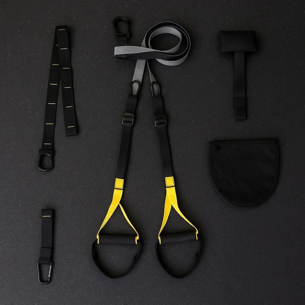 Contents: Adjustable straps with foam handles, suspension anchor, door anchor
